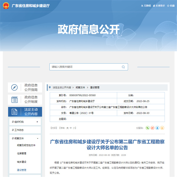 2022年8月30日,廣東省住房和城鄉(xiāng)建設(shè)廳網(wǎng)站發(fā)布第二屆廣東省工程勘察設(shè)計(jì)大師評(píng)選結(jié)果,公司總工程師徐波、首席專家靳守杰、特聘專家王建新榜上有名,獲評(píng)廣東省工程勘察設(shè)計(jì)大師。同時(shí)獲評(píng)3位廣東省工程勘察設(shè)計(jì)大師,體現(xiàn)了公司在尖端科技人才培養(yǎng)、專家團(tuán)隊(duì)建設(shè)的發(fā)展優(yōu)勢(shì),標(biāo)志著公司在人才工程建設(shè)方面取得了階段性勝利,為企業(yè)技術(shù)創(chuàng)新、成果轉(zhuǎn)化、人才培養(yǎng)等方面提供了更廣闊的發(fā)展空間。