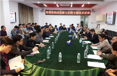 在二個(gè)多小時(shí)的報(bào)告中,聶院士首先深情回憶起二十年前和陳宜言董事長(zhǎng)一起在深圳彩虹(北站)橋設(shè)計(jì)中開展組合橋面系結(jié)構(gòu)創(chuàng)新工作的經(jīng)歷和寶貴經(jīng)驗(yàn),贊揚(yáng)了我公司多年以來(lái)在堅(jiān)持以鋼-混凝土組合結(jié)構(gòu)橋梁為主的設(shè)計(jì)中取得突出成績(jī)。隨后聶院士系統(tǒng)介紹了鋼-混凝土組合結(jié)構(gòu)的最新研究成果,通過(guò)大量的工程設(shè)計(jì)案例數(shù)據(jù)對(duì)比,展示了在中、小跨徑橋梁中使用鋼-混凝土組合結(jié)構(gòu)的各項(xiàng)顯著優(yōu)點(diǎn),扭轉(zhuǎn)了設(shè)計(jì)人員在日常工作中的部分片面認(rèn)識(shí),深刻理解了設(shè)計(jì)是工程靈魂的先進(jìn)理念。