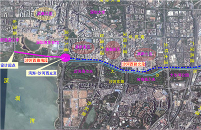 沙河西路位于深圳市南山區(qū),起點(diǎn)位于東濱路,終點(diǎn)至茶光路口,全長約7.43公里。按城市快速路標(biāo)準(zhǔn)建設(shè),主線雙向6車道,主線設(shè)計車速60km/h,濱海-沙河西立交部分匝道設(shè)計車速50km/h,其余輔道及匝道設(shè)計車速30公里/小時。改造內(nèi)容包括:主車道和兩側(cè)輔道路面加鋪瀝青混凝土,完善全線輔道系統(tǒng)、主輔出入口及立交節(jié)點(diǎn)的改造優(yōu)化,新建人行過街天橋6座,延長現(xiàn)狀天橋1座,新增港灣式公交站6對,重新鋪設(shè)人行道板磚,更換現(xiàn)狀混凝土立道牙、完善交通及交通監(jiān)控設(shè)施以及完善相關(guān)市政管線設(shè)施等。