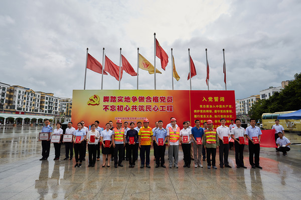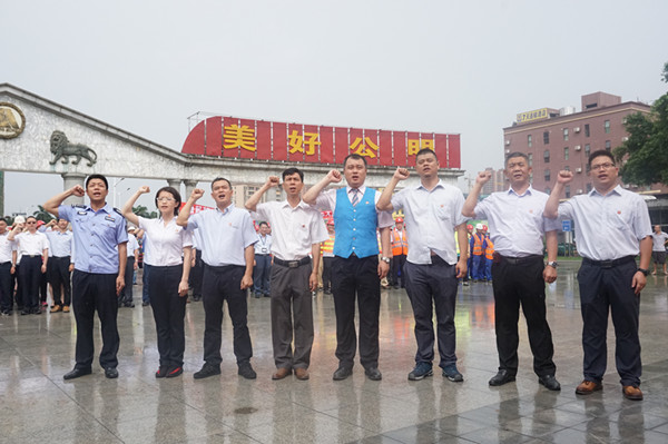 隨后在公明廣場,集團(tuán)黨委開展了“七·一”表彰暨新黨員入黨宣誓活動(dòng)。集團(tuán)黨委隆重表彰了一年來涌現(xiàn)出的黨建工作先進(jìn)集體和個(gè)人,為獲獎(jiǎng)代表頒發(fā)榮譽(yù)證書并合影留念。在集團(tuán)黨群工作部李湘楓部長的領(lǐng)誓下,全體黨員冒雨面對(duì)鮮紅的黨旗,用洪亮的聲音莊嚴(yán)宣誓,表明了自己為黨和國家奮斗終身的堅(jiān)定決心。