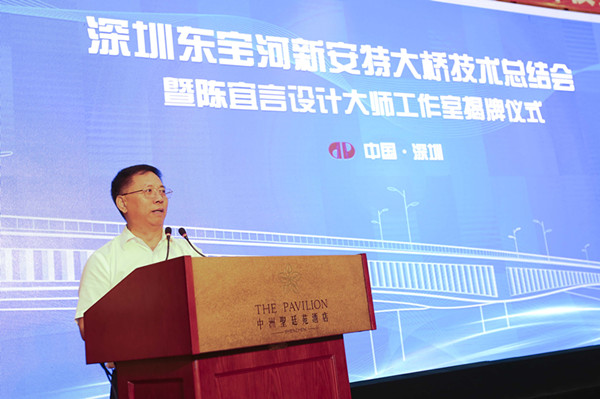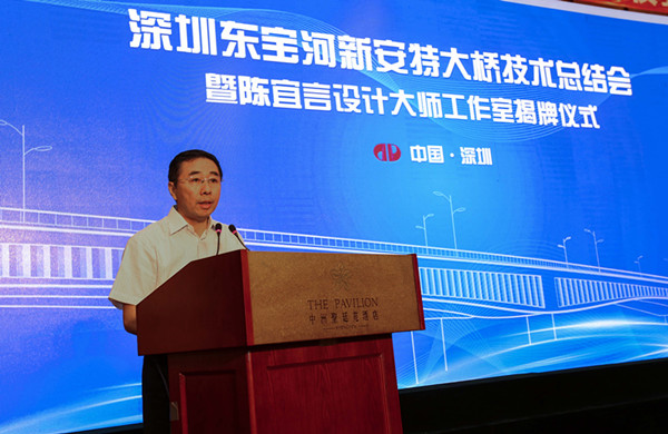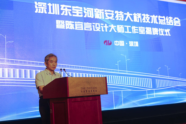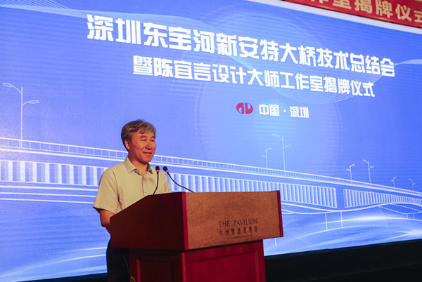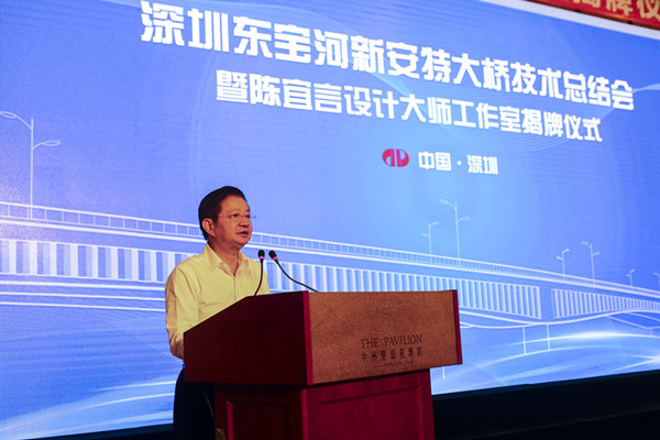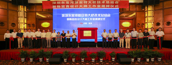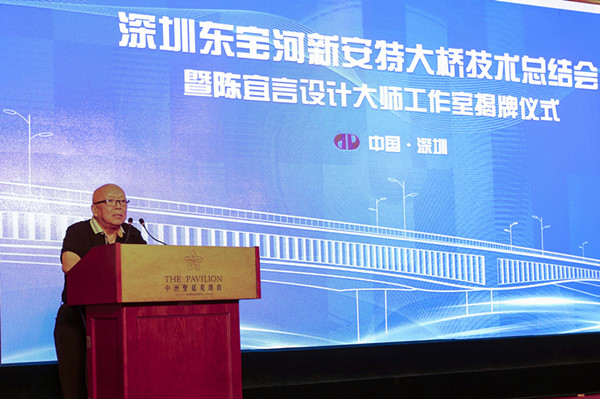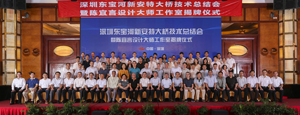 2017年7月29日,深圳東寶河新安特大橋技術總結會暨陳宜言設計大師工作室揭牌儀式在圣廷苑酒店隆重舉行。中國工程院孟建民、聶建國、陳政清等3位院士,全國工程勘察設計大師王用中、羅玲(女)、車宇琳、丘建金、何昉等7位大師,11所全國重點高校15名組合結構教授,以及深圳市委組織部、市科協、市交委、市國資委、市住建局、市地質局、市人社局、國新南方知識產權研究院、地鐵集團領導,行業(yè)協會領導及專家160余人出席大會。地鐵集團陳湘生總工程師主持會議,陳宜言設計大師和清華大學聶建國院士、東南大學宗周紅教授分別作了專題技術報告。