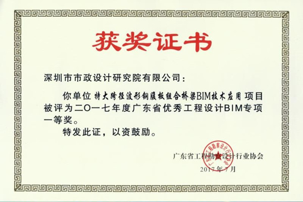 近日,我公司“特大跨徑波形鋼腹板組合橋梁BIM技術(shù)應(yīng)用”項目被評為2017年度廣東省優(yōu)秀工程設(shè)計BIM專項一等獎。