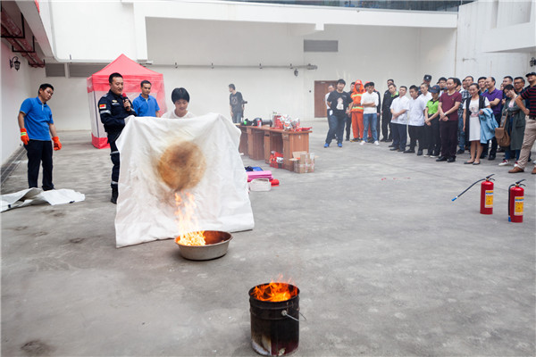 現(xiàn)場演示滅火毯的使用方法 現(xiàn)場演示滅火器的使用方法 現(xiàn)場演示心肺復蘇急救方法 消防大演練合影