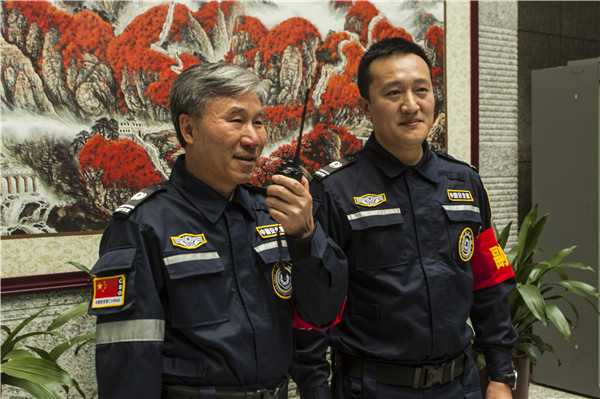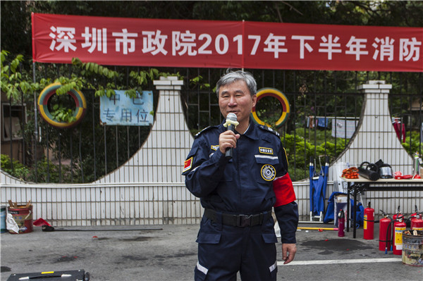 在消防演習(xí)中,模擬大廈主樓9樓突發(fā)火災(zāi)。保安員發(fā)現(xiàn)火情后及時上報,橋業(yè)物業(yè)啟動消防應(yīng)急預(yù)案。應(yīng)急廣播傳出“主樓9樓發(fā)生火情,請各位不要慌張,立即從樓梯撤離至大廈地面停車場南區(qū),不要使用電梯。”樓里濃煙彌漫開來,辦公人員聞訊后,迅速從樓梯撤離,消防滅火、疏散警戒、秩序控制和后勤保障小組迅速就位,各項報警、滅火、救援、疏散工作緊張有序的開展,控制了初期火情。當(dāng)發(fā)現(xiàn)一臺小汽車堵住消防通道時,救援組使用先進(jìn)的移車設(shè)備,在一分鐘內(nèi)將小汽車移開,及時疏通了生命通道, 待義務(wù)消防員趕到后完全撲滅了大火。