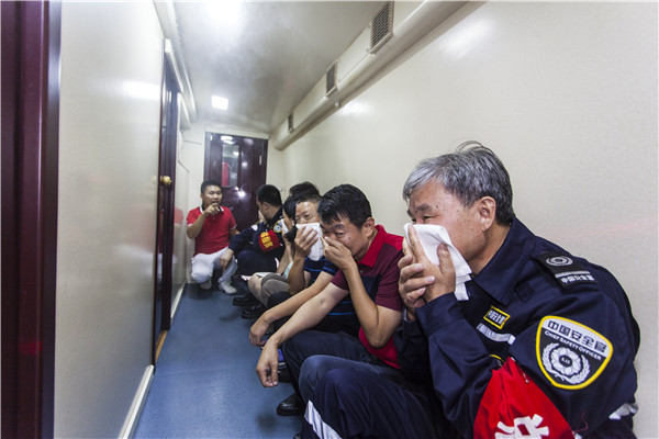 陳宜言董事長、蔡明總經(jīng)理在消防宣傳車上體驗煙層逃生