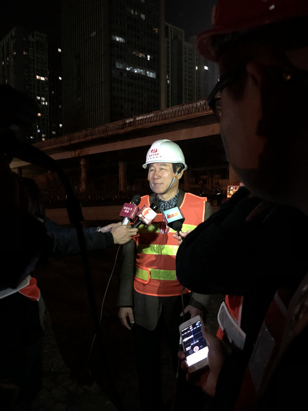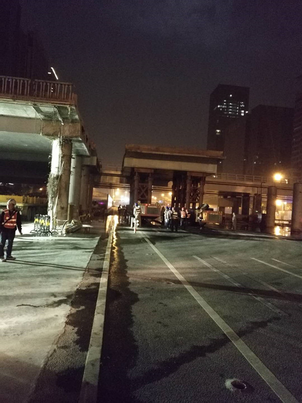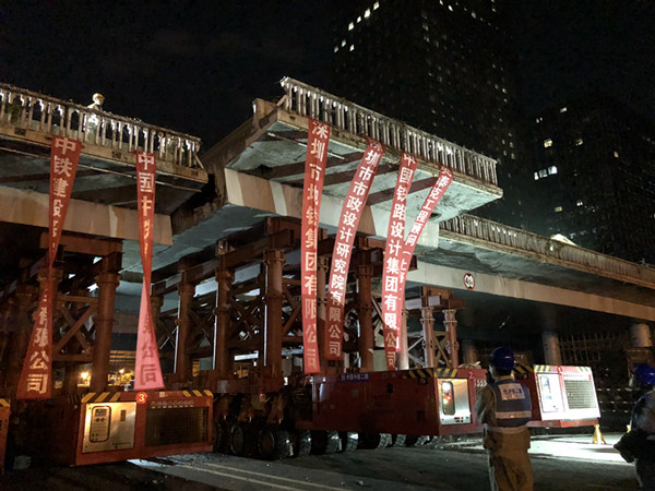 施工單位提前完成橋面設(shè)施拆除、鉆孔、設(shè)備安裝等準(zhǔn)備工作后,2017年12月29日晚11點開始拆橋工作,至2018年1月2日凌晨4點深南大道南北兩側(cè)交替封道4晚,彩田橋中間4跨連續(xù)梁采用SPMT模塊車順利拆除。拆除橋梁長度約200m,共切割成22段梁體,單個梁體最大重量達300t,是目前國內(nèi)首座采用SPMT模塊車快速拆除的預(yù)應(yīng)力混凝土連續(xù)梁橋。全橋拆除時間與建設(shè)福田樞紐時60天拆除益田橋相比,時間僅為其1/6,我公司的技術(shù)創(chuàng)新充分證明了“深圳速度”,而且為橋梁工程的發(fā)展增添了寶貴經(jīng)驗。