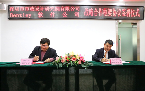 2018年4月24日上午,公司與BENTLEY軟件(北京)有限公司(以下簡稱“BENTLEY公司”)戰(zhàn)略合作框架協(xié)議簽署儀式在市政設(shè)計大廈一樓技術(shù)交流中心舉行。公司總經(jīng)理蔡明、副總經(jīng)理許華林以及相關(guān)部門負責(zé)人,BENTLEY公司北亞區(qū)總裁劉德盛、技術(shù)總監(jiān)李翔等領(lǐng)導(dǎo)與嘉賓參加了簽署儀式。公司總經(jīng)理蔡明與BENTLEY公司北亞區(qū)總裁劉德盛分別代表雙方在戰(zhàn)略合作框架協(xié)議上簽字。
