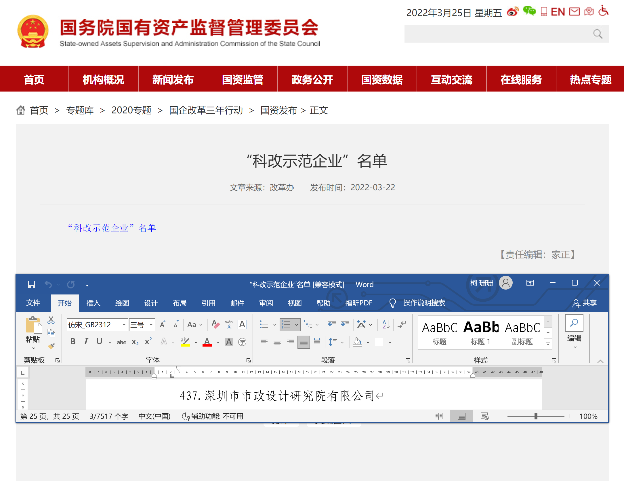 日前,國務院國資委公布最新的“科改示范企業(yè)”名單,深圳國資系統(tǒng)7家企業(yè)成功入選,深圳市政院榜上有名。