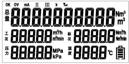 顯示介質(zhì)壓力、溫度、瞬時流量、累計標準流量、電池電壓等。