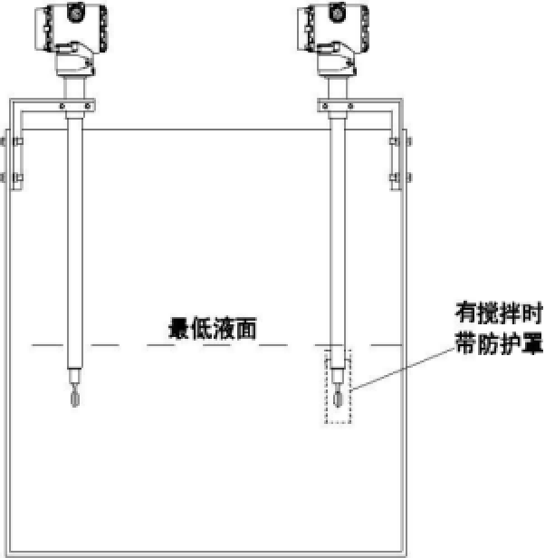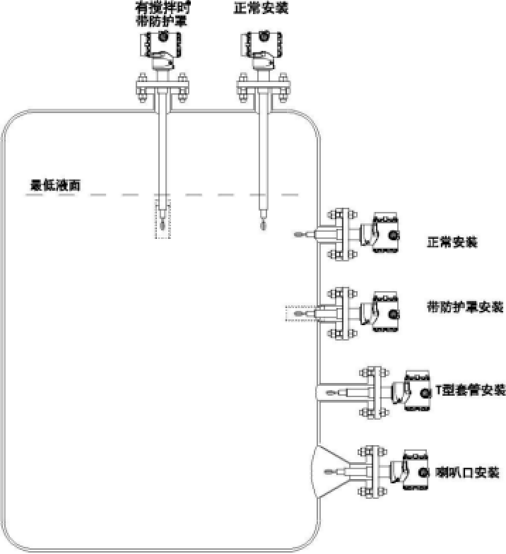 A、 罐體頂部安裝時(shí),與敞口池安裝類(lèi)似,音叉叉體應(yīng)在液面以下,有攪拌時(shí)需帶防護(hù)罩,一般針對(duì)只有頂部開(kāi)口的罐或埋地罐。要改變插入深度,可以使用一段帶有法蘭的支座。