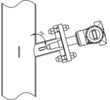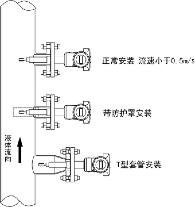垂直安裝時(shí),采用垂直向上流向的管道上安裝密度/濃度計(jì),在流速≤大約O.5m/s 時(shí),按照上圖安裝。