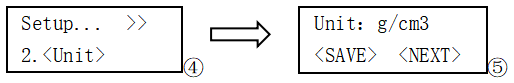 ⑤按 Z 或 S 選擇所需單位,按 M 光標(biāo)移至SAVE,再按 M 確認(rèn)保存。自動(dòng)退出單位設(shè)定。
